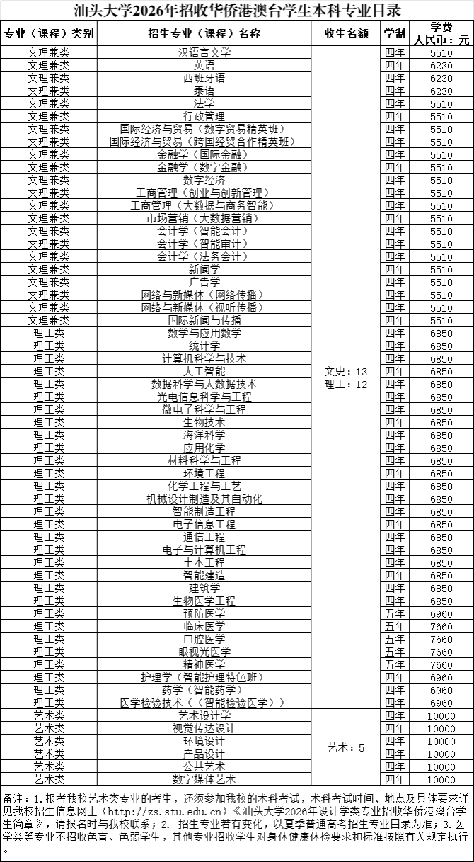 招生计划30人(最终以联招办公布为准),招生专业名称详见《汕头大学2026年招收华侨港澳台学生本科专业目录》(招生专业若有变化,以夏季普通高考招生专业目录为准)。