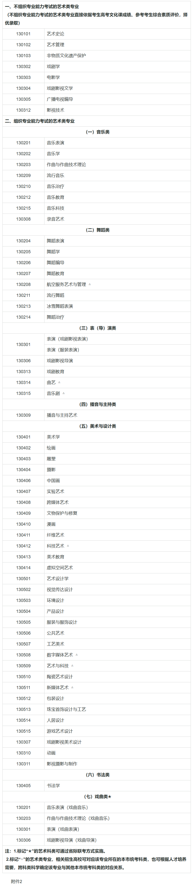 1.教育部《普通高校艺术类考试招生本科专业目录》中艺术史论、艺术管理、非物质文化遗产保护、戏剧学、电影学、戏剧影视文学、广播电视编导、影视技术8个专业和《北京市高等职业教育艺术类考试招生本科和专科专业目录》中数字广播电视技术、影视编导等16个专业,不再进行艺术类专业能力考试,直接依据考生高考文化课成绩,参考考生综合素质评价,择优录取考生。