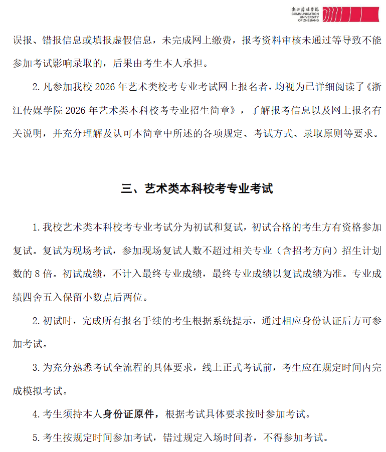 主页 > 招生简章 > 浙江传媒学院2026年艺术类本科校考专业招生简章