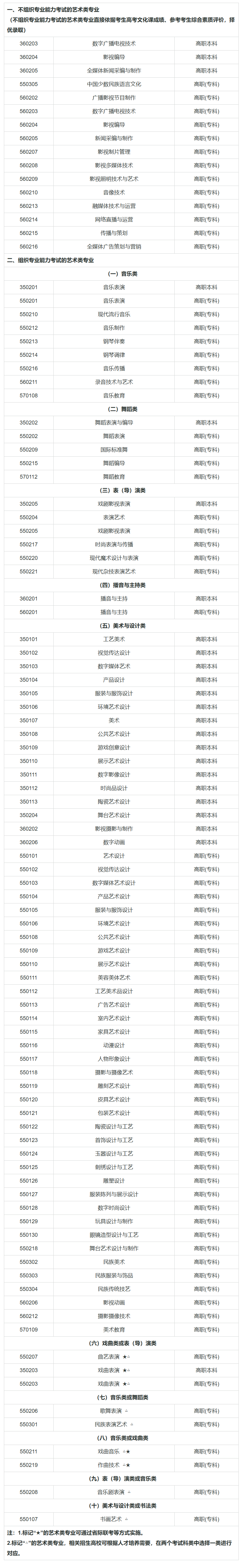 1.教育部《普通高校艺术类考试招生本科专业目录》中艺术史论、艺术管理、非物质文化遗产保护、戏剧学、电影学、戏剧影视文学、广播电视编导、影视技术8个专业和《北京市高等职业教育艺术类考试招生本科和专科专业目录》中数字广播电视技术、影视编导等16个专业,不再进行艺术类专业能力考试,直接依据考生高考文化课成绩,参考考生综合素质评价,择优录取考生。