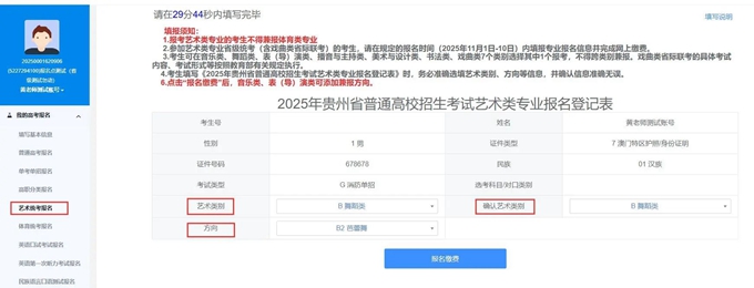 报考艺术类专业考试的考生,进入【我的高考报名】->【艺术统考报名】菜单,填报相关信息并网上缴费。