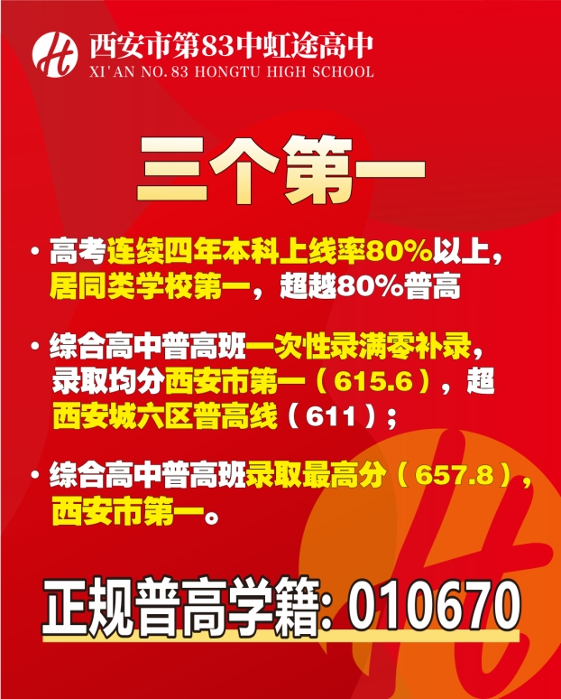 该校是83中名校+合作校。学校管理严格,称为“衡水模式西安分校”,是性价比很高的升学学校,有83中骨干教师定期授课,本科上线率近三年持续上涨。2025年为81.3%参考学费:30000元/年。(不同班型收费略有不同 以官方公众号为主)