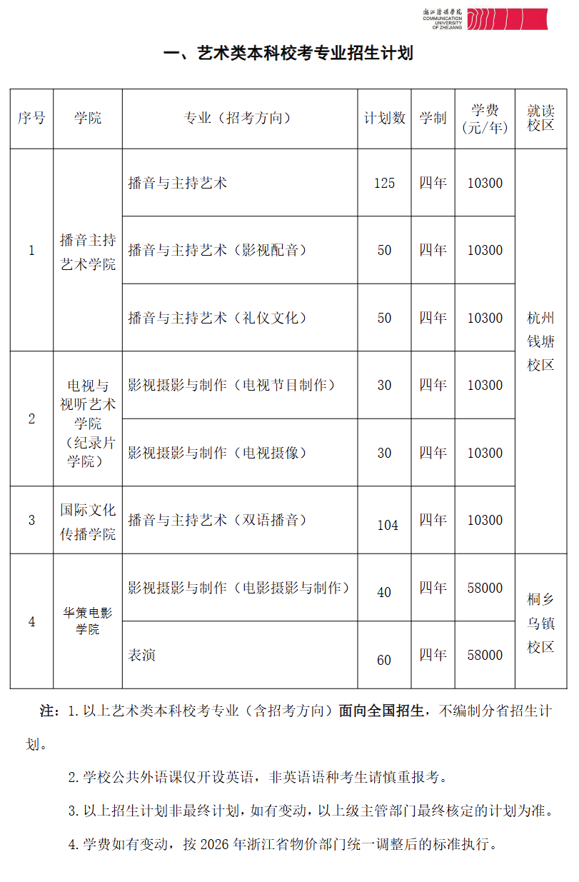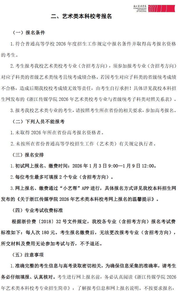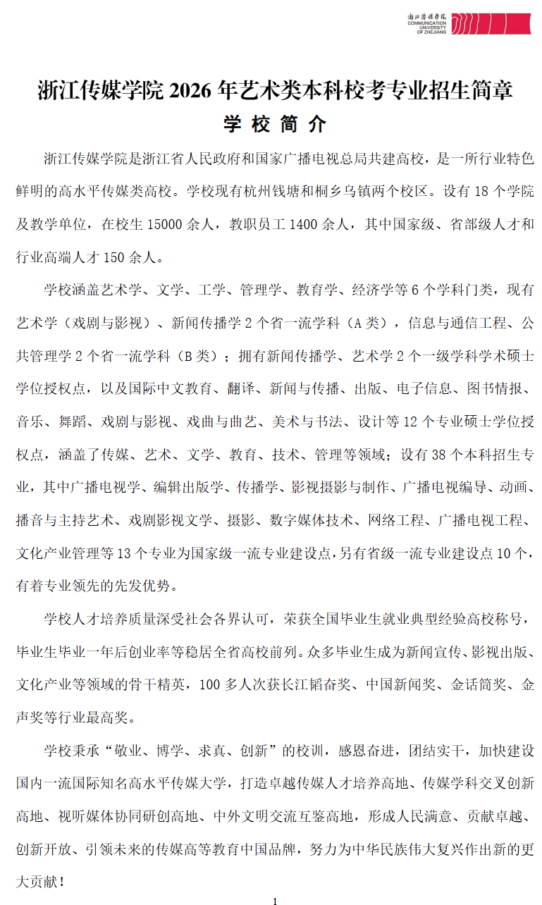 主页 > 招生简章 > 浙江传媒学院2026年艺术类本科校考专业招生简章