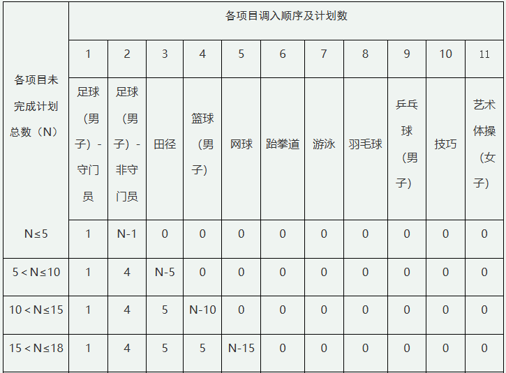 4.我校各专业在项目二志愿录取未完成的情况下,将进行计划调整,剩余的招生计划将优先调整至我校重点发展的足球(男子)-守门员、足球(男子)-非守门员、田径、篮球(男子)、网球、跆拳道、游泳、羽毛球、乒乓球(男子)、技巧、艺术体操(女子)项目。上述调剂项目除标注性别要求的项目外,其余项目不再分性别,其中田径项目按照综合分由高到低排序,不再分小项。各项目调入顺序及计划数安排如下: