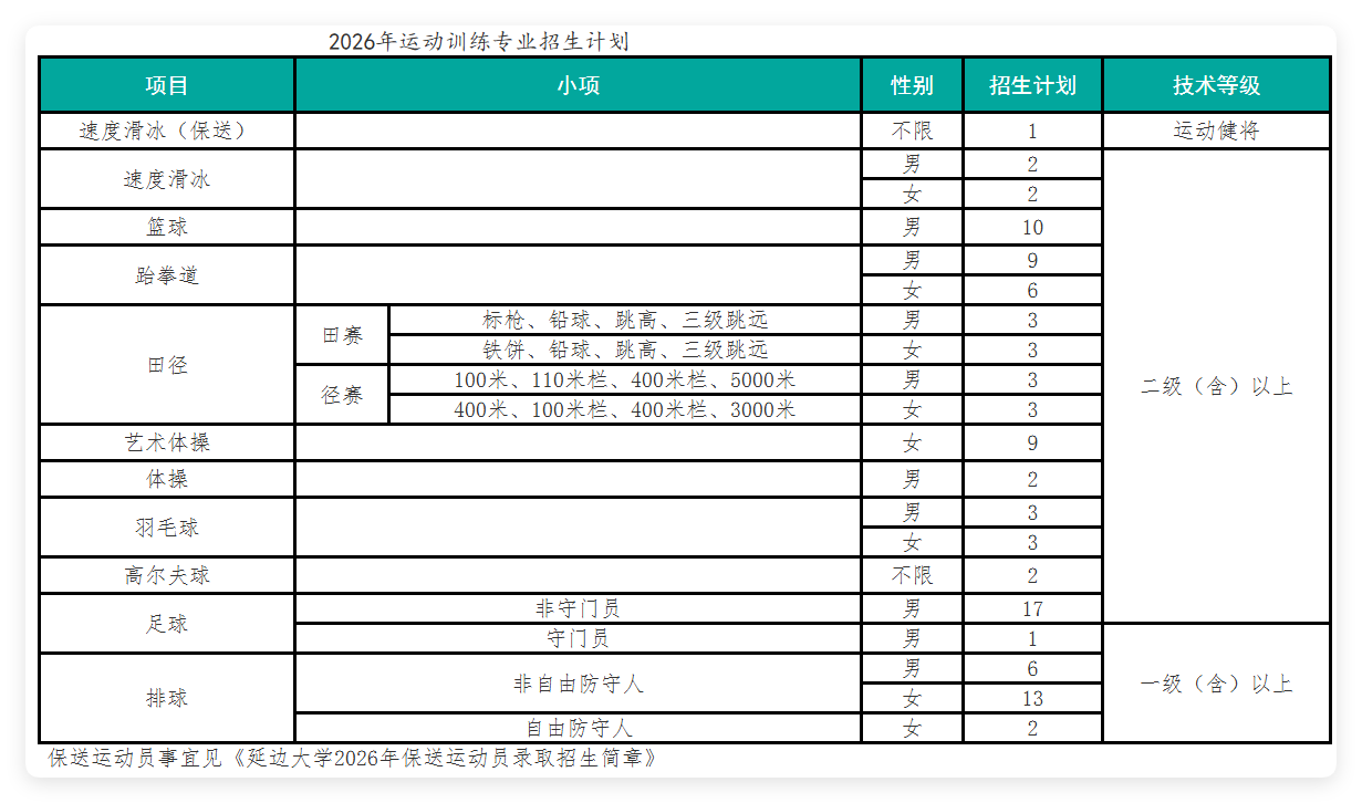 (二)具备我校招生项目之二级(含)运动员以上技术等级称号,其中排球、足球守门员须具备一级(含)以上运动员技术等级称号,考生运动员技术等级以“国家体育总局运动员技术等级系统”公示的数据信息为准。