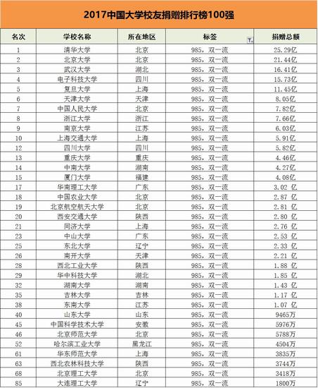 首先,在中国高校校友捐赠百强榜中,原985高校,现“双一流”建设高校占据了榜单的“半壁江山”。这应该就是院校层次与毕业生就业层次之间良性互动的最好写照。