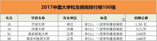 其次,在中国高校校友捐赠百强榜中,原211高校,也有收获。其中北京的院校有所上榜,江苏的院校有5所上榜,陕西的院校有3所上榜。这三个省份同时也是高等教育资源比较集中的省份。同时,也可以在此看到四所财经院校的校友捐赠数量的大差异。谁的校友更“强悍”一见高下。